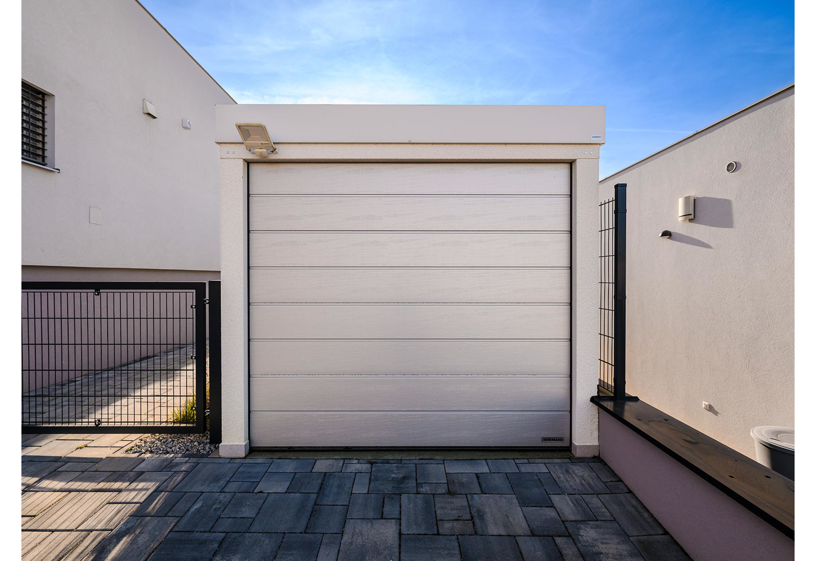 Garáž snov existuje! Priestranná montovaná garáž so špičkovými garážovými bránami Hörmann má zabudované osvetlenie a je možné ju napájať solárnymi panelmi. Bezpečnostné brány sa šikovne zatvárajú k stropu, čím šetria miesto. Ultratiché otváranie a zatváranie brány je skvelým bonusom.