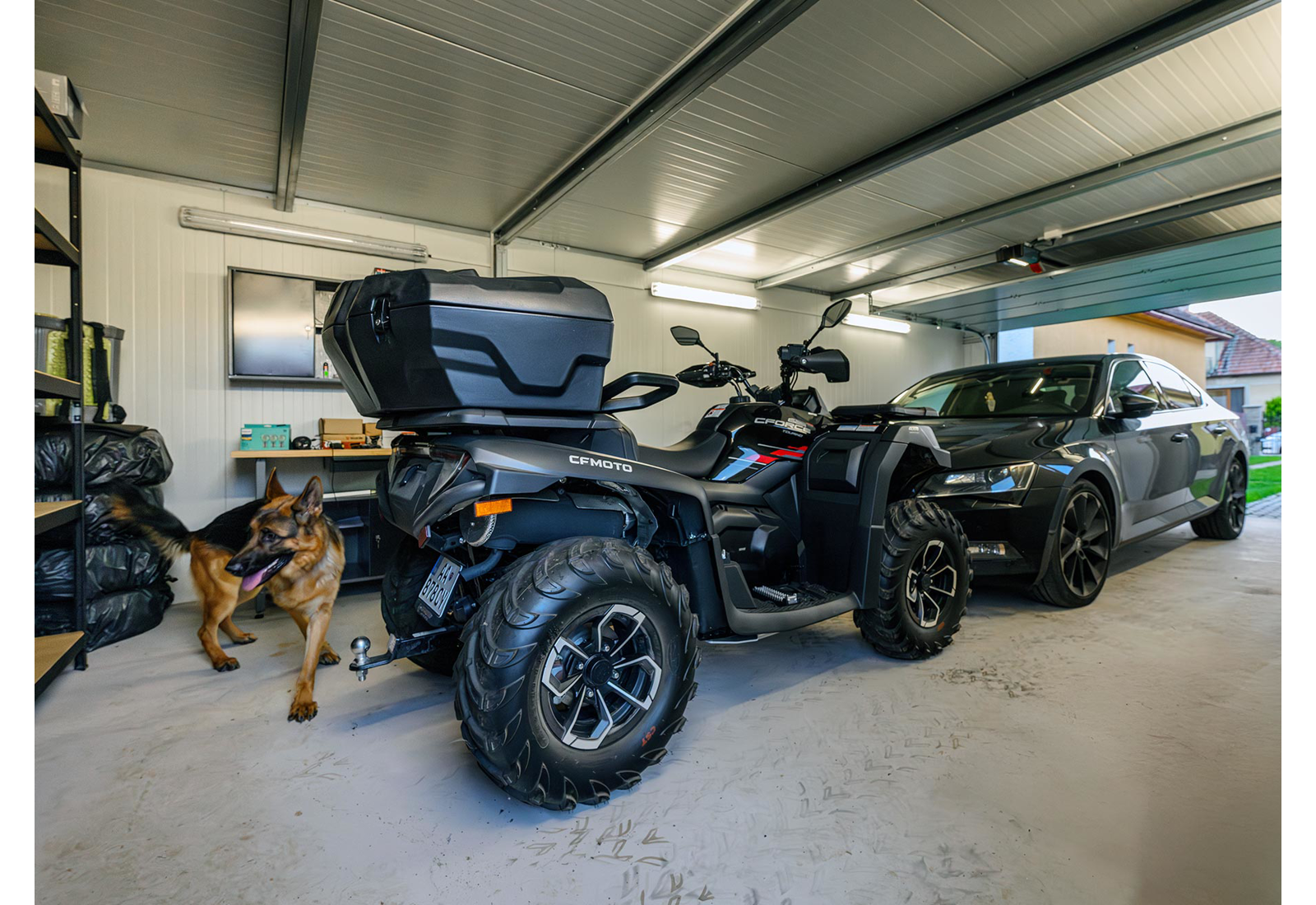 Garáž snov existuje! Priestranná montovaná garáž so špičkovými garážovými bránami Hörmann má zabudované osvetlenie a je možné ju napájať solárnymi panelmi. Bezpečnostné brány sa šikovne zatvárajú k stropu, čím šetria miesto. Ultratiché otváranie a zatváranie brány je skvelým bonusom.