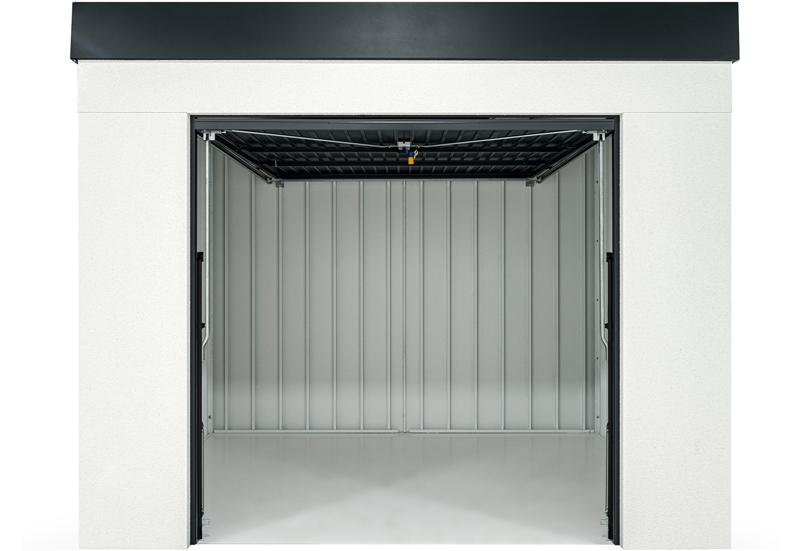 Priestranný záhradný domček so špičkovými garážovými bránami Hörmann má zabudované svetlo a je možné ho napájať zo solárnych panelov. Bezpečnostná brána sa šikovne zatvára k stropu a šetrí priestor. Ultratiché otváranie a zatváranie brány je skvelým bonusom.