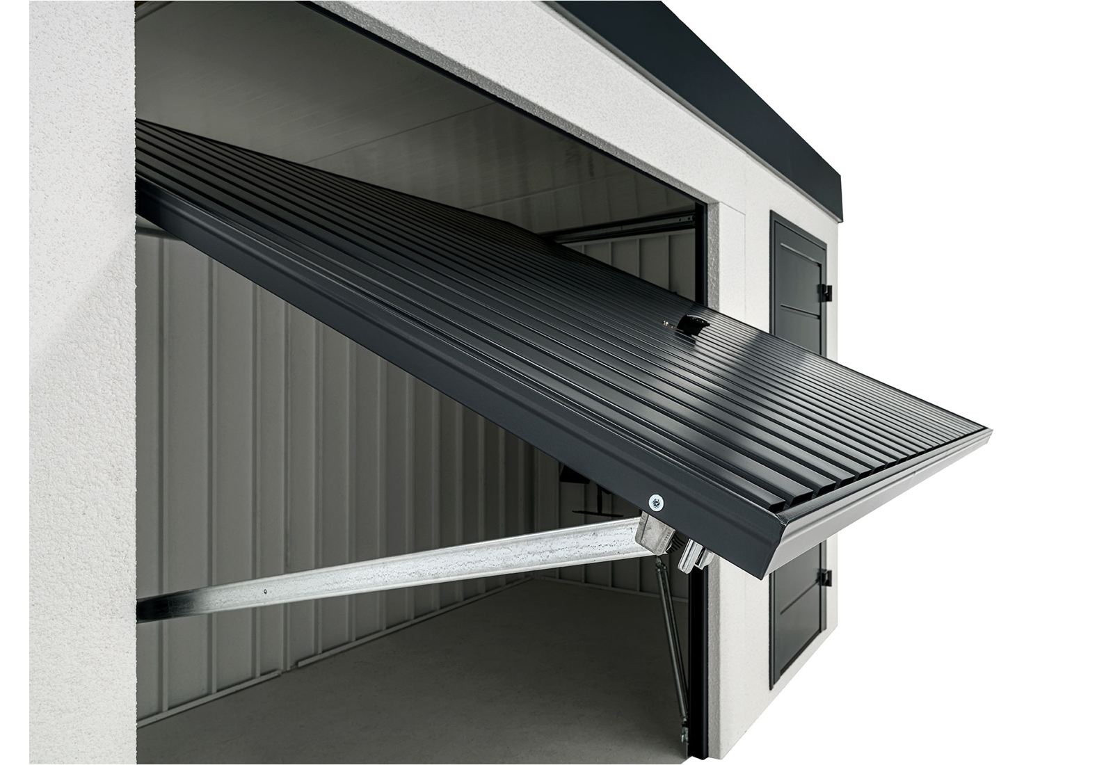 Priestranný záhradný domček so špičkovými garážovými bránami Hörmann má zabudované svetlo a je možné ho napájať zo solárnych panelov. Bezpečnostná brána sa šikovne zatvára k stropu a šetrí priestor. Ultratiché otváranie a zatváranie brány je skvelým bonusom.