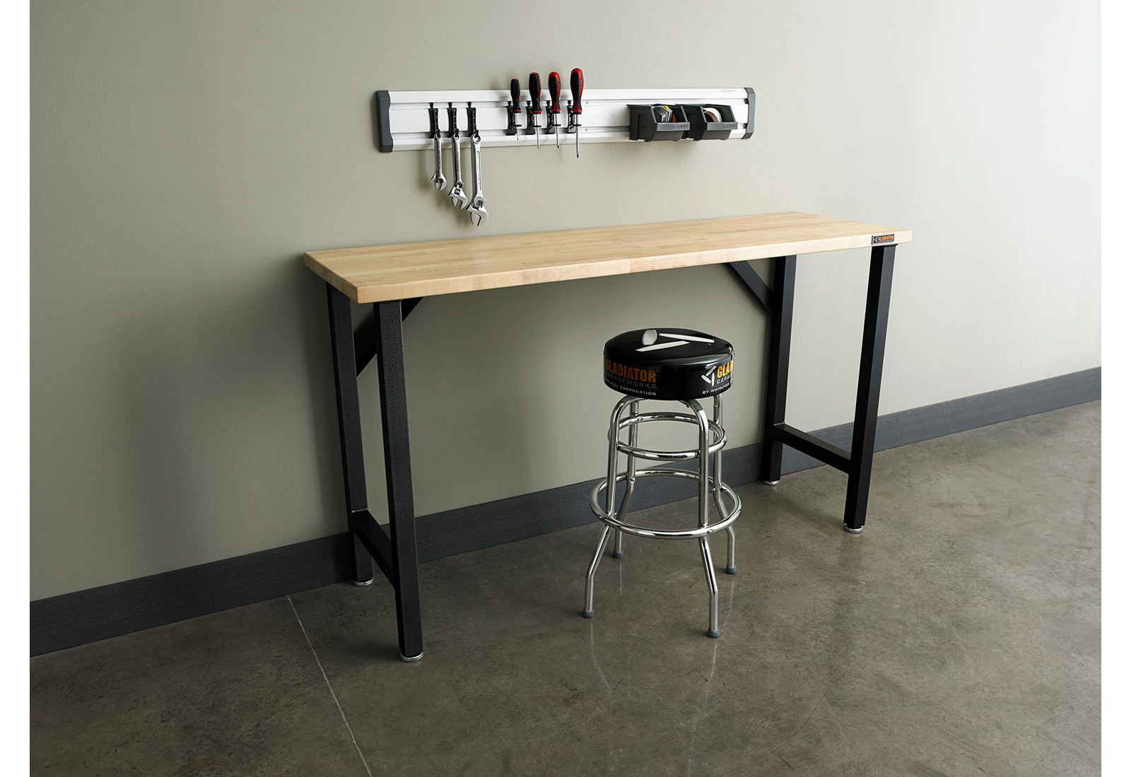 Tento pracovný stôl GLADIATOR® má 169 cm dlhú dosku z masívneho tvrdého dreva a oceľové vyrovnávacie nohy, ktoré unesú až 680 kg rozloženej hmotnosti, čo z neho robí ideálny povrch na projekty od záhradkárčenia až po opravy automobilov.