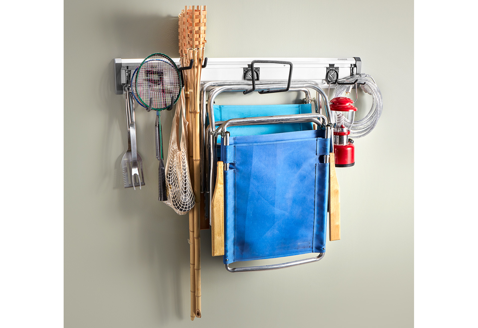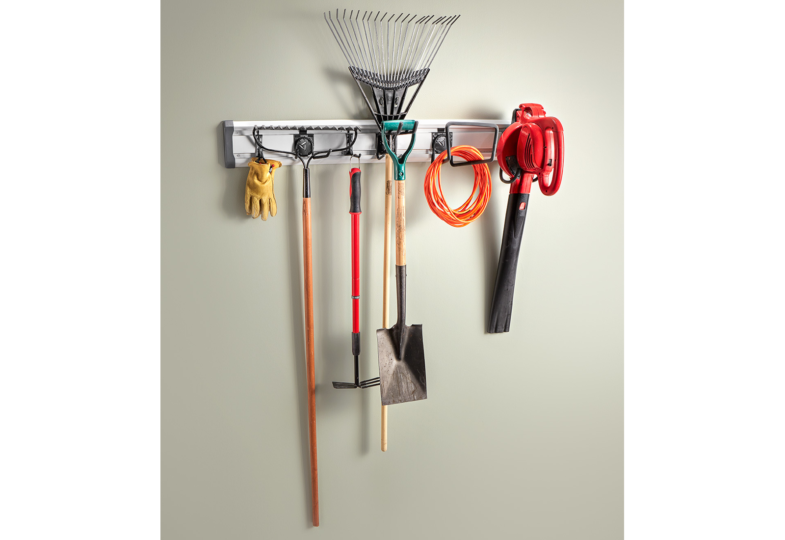 Sada GearTrack® na trávnik a záhradu obsahuje štyri odolné háky a dva ľahké háky. Veľký hák použite na zavesenie záhradného náradia, napríklad odstraňovača buriny, a háky J a L na zavesenie menších predmetov, napríklad lepiacej pásky, rukavíc, hadíc alebo ručného náradia.